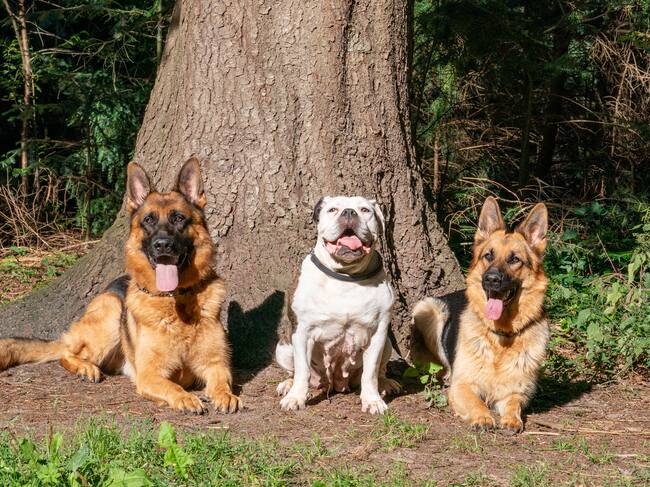 Un bulldog inglés y dos pastores alemanes en el parque (Foto vía Getty Images) / Gea Veenstra