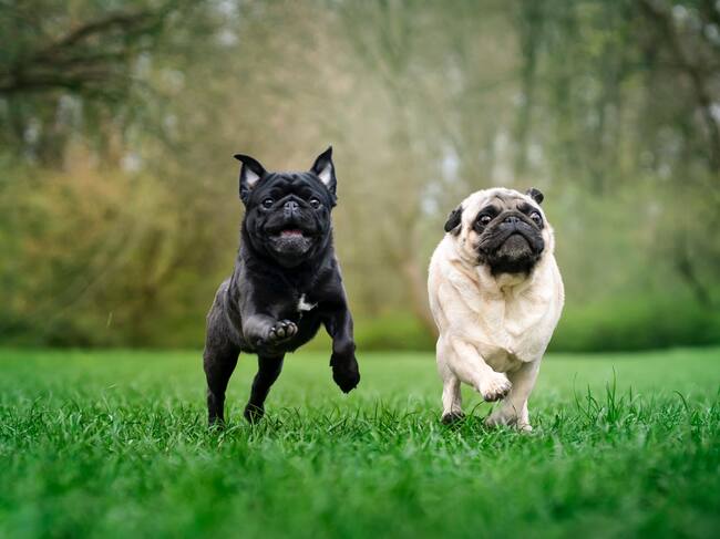 Dos perros Pug corriendo en el parque (Foto vía Getty Images) / Anita Kot