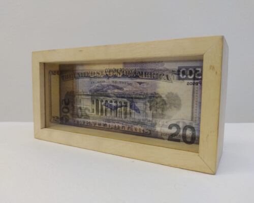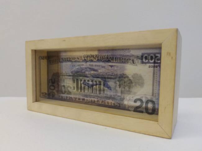 Julian Zalamea “Verdes son azules “ 18 cm x 9 cm x 6 cm Ensamblaje con billetes impresos sobre capas acrílicas 2023 $1´600.000 Pesos Legado del Arte 2023 julianzalamea@yahoo.com