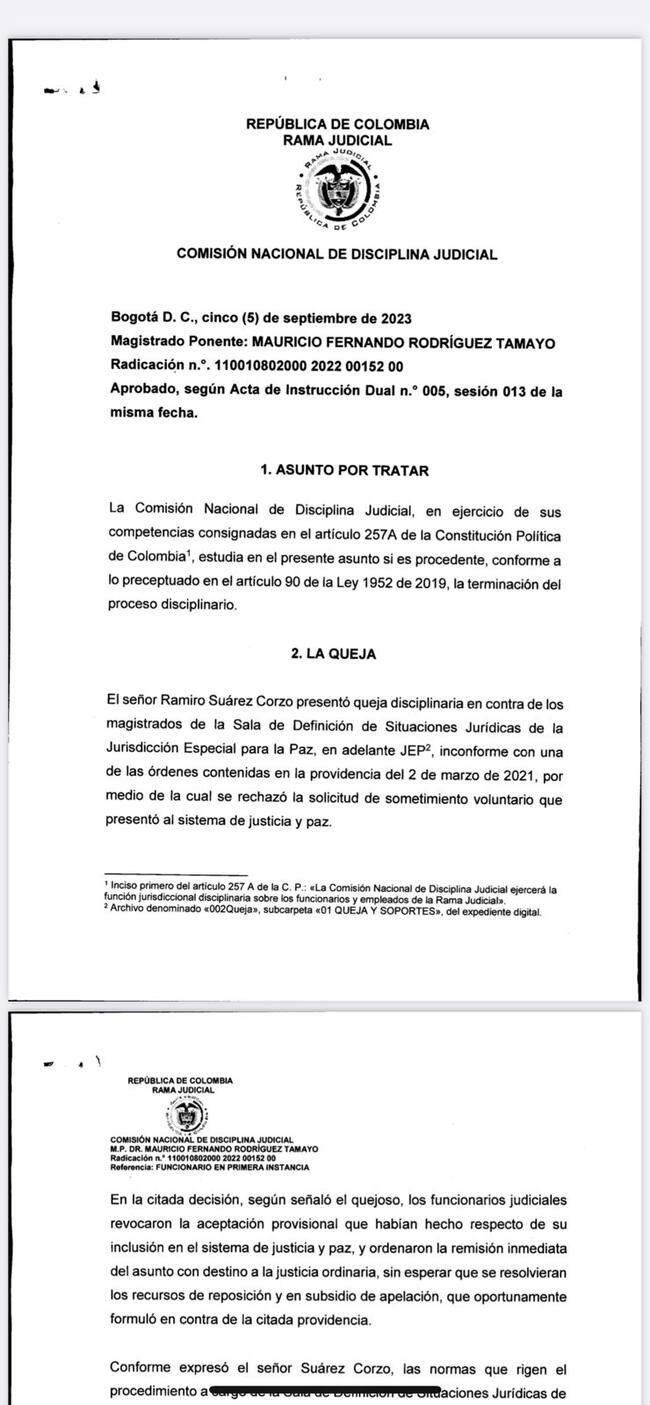La Comisión de Disciplina Judicial archivó la queja del exalcalde de Cúcuta Ramiro Suárez Corzo, en contra de los magistrados de la Jurisdicción Especial para la Paz (JEP), así se caería otro intento de Suárez para que se indague a los magistrados por haberlo rechazado.