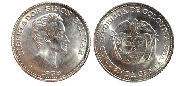 Hecha en cobre y níquel, este ejemplar pesa 12,56 gramos y en su reverso está la cara de Simón Bolívar, expresidente de la Gran Colombia. Es vendida por coleccionistas desde los 6 mil pesos hasta los 400 millones de pesos colombianos si la moneda nunca estuvo en circulación.