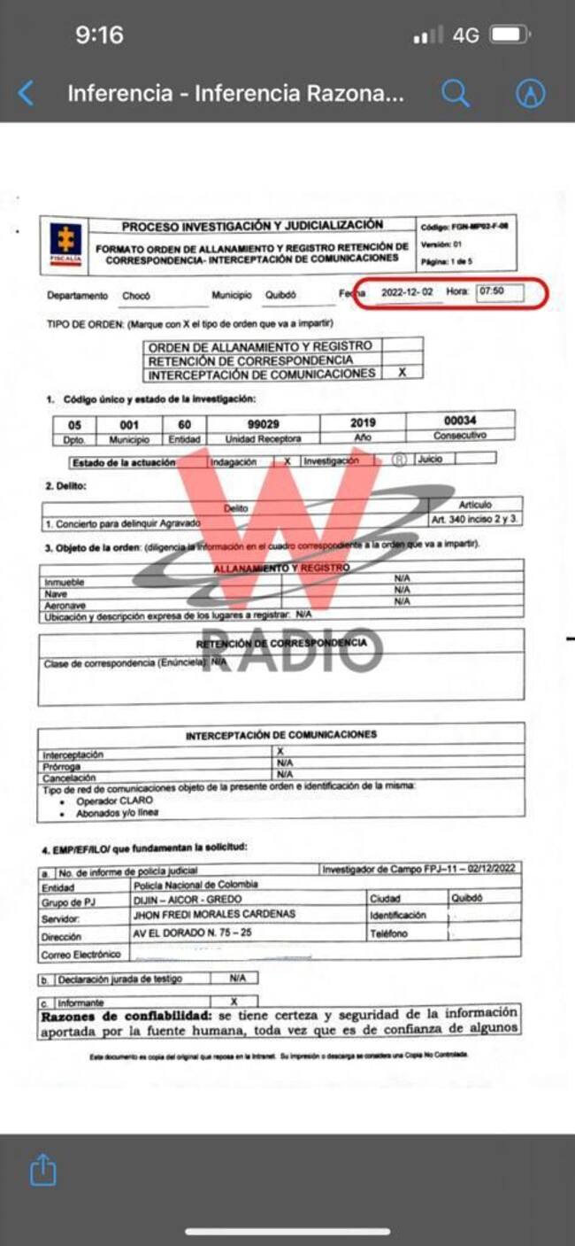 La información está registrada en un reporte de Policía Judicial producido un día antes, el 1 de diciembre de 2022 a las 9:22 de la mañana. En ese informe se menciona que una fuente humana entregó información y teléfonos de alias ‘La Cocinera’, alias ‘Sacerdote’, y alias ‘Chibolito’, integrantes de la estructura del jefe del Clan del Golfo, Wilmer Antonio Giraldo, alias ‘Siopas’.