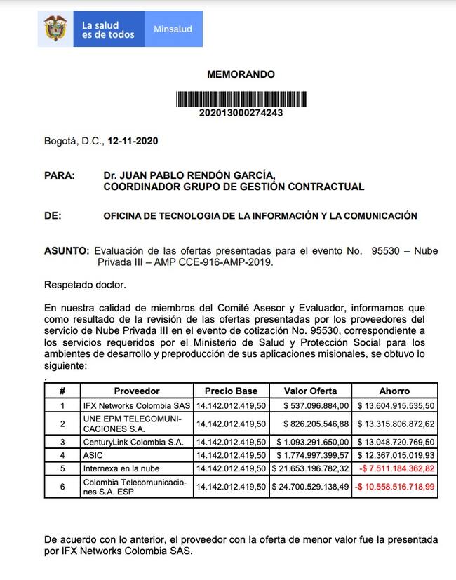 El precio que el Ministerio de Salud tenía destinado era de $14.142.012.419 de pesos, acá ofertaron además de IFX, UNE, Centurylink, ASIC, Internexa y Colombia Telecomunicaciones. El contrato se le dio a IFX, porque era el que menos pedia para desarrollar los servicios ($537.096.884) y la justificación del ministerio para elegirlos es que se estaban ahorrando $13. 604.915.535.