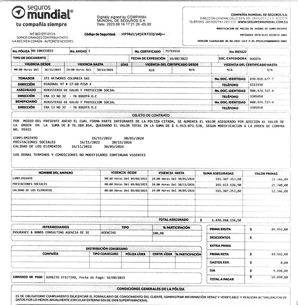 Uno de los puntos del contrato es garantizar la protección de datos e información entregada por las Entidades Compradoras, punto que se incumplió debido al ciberataque que sufrio IFX Networks lo que le permitiría al Ministerio cobrar la póliza. Sin embargo y según los documentos en colombiacompra.gov.co la suma de la póliza es de 59.000 pesos.