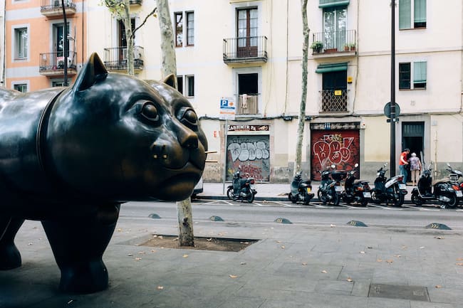 En España se encuentran varias esculturas de Botero, como ‘Mujer con Espejo’ y el ‘Gato’, una de sus obras más famosas, que se encuentra ubicada en la Rambla de Raval en Barcelona, donde se ha convertido en un personaje famoso en el barrio.