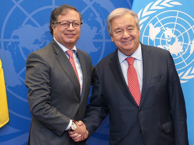 Gustavo Petro mientras saluda al secretario general de la ONU, Antonio Guterres, en Nueva York (Estados Unidos). Foto: EFE/ Presidencia de Colombia.