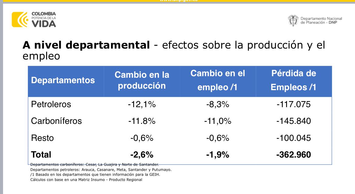 Un estudio del Departamento Nacional de Planeación (DNP), la CEPAL y la Agencia Francesa para el Desarrollo concluyó que si el país reduce a la mitad la producción de petróleo y de carbón habría una disminución del crudo del 12,1% en los departamentos petroleros y un 11,8% en la producción del carbón y se perderían entre 117 y 145 mil empleos.