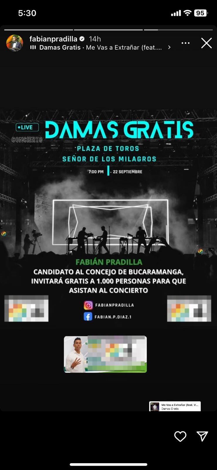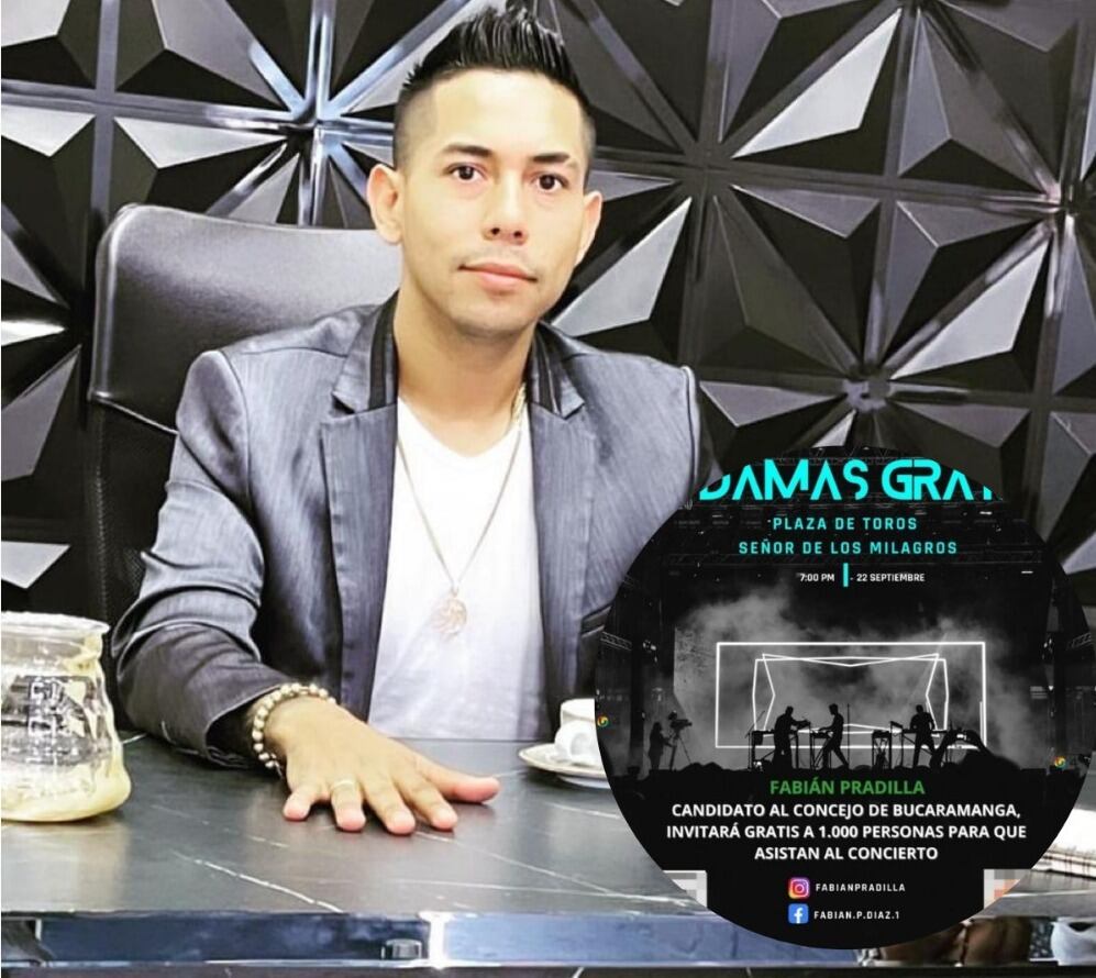 El candidato al concejo de Bucaramanga, Fabián Pradilla, a través de sus redes sociales difundió una imagen en donde asegura que estará regalando 1.000 boletas para las personas que quieran asistir a un concierto que se va a realizar este viernes en la capital santandereana.