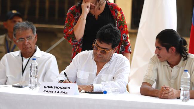 AME862. SUÁREZ (COLOMBIA), 19/09/2023.- El alto comisionado para la paz en Colombia, Danilo Rueda (c), firma un documento durante una mesa de diálogos con las disidencias de las FARC, hoy, en Suárez (Colombia). El Gobierno colombiano y el Estado Mayor Central (EMC), principal disidencia de las ya disueltas FARC, instalarán la mesa de diálogo el próximo 8 de octubre, cuando también arrancará un cese el fuego bilateral que se extenderá por 10 meses. EFE/ Ernesto Guzmán / Ernesto Guzmán (EFE)