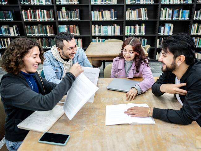 Estudiantes universitarios compartiendo en la biblioteca (Foto vía Getty Images) / Frazao Studio Latino