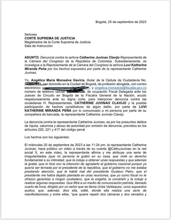“Solicito que se llame a declaración, a la representante Catherine Juvinao Clavijo, a efectos de ampliar y darle claridad, a lo que ella manifiesta sobre los presuntos hechos delictivos desplegados aparentemente, por la representante Luvi Katherine Miranda Peña, y que aporte las pruebas de sus afirmaciones”, apartes de la denuncia de Monsalve.