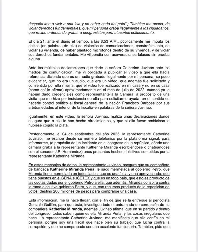 “El 04 de septiembre del año 2023, la representante Catherine Juvinao, me escribe desde su número telefónico por la plataforma signal, para informarme, (a propósito de un incidente en el congreso de la república, dónde una cámara graba a la representante Katherine Miranda escribiéndose o chateándose con el senador J.P. Hernández) unos presuntos hechos delictivos cometidos por la representante Katherine Miranda”.
