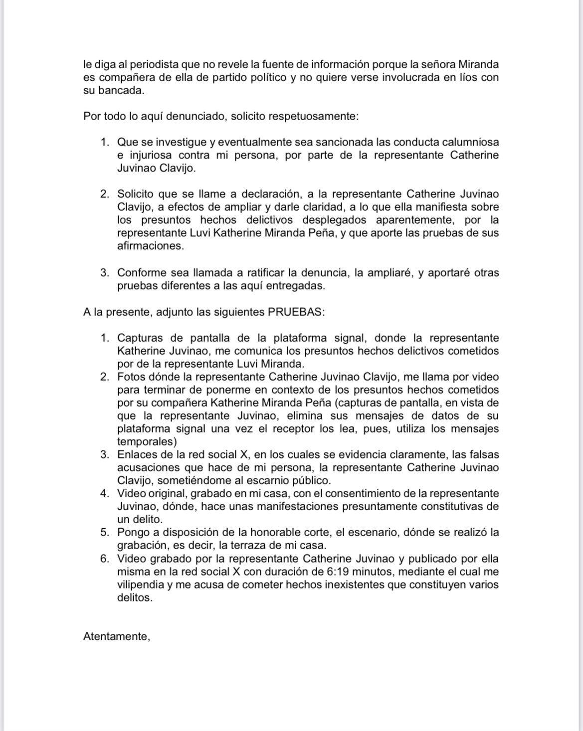 “Solicito que se llame a declaración, a la representante Catherine Juvinao Clavijo, a efectos de ampliar y darle claridad, a lo que ella manifiesta sobre los presuntos hechos delictivos desplegados aparentemente, por la representante Luvi Katherine Miranda Peña, y que aporte las pruebas de sus afirmaciones”, apartes de la denuncia de Monsalve.