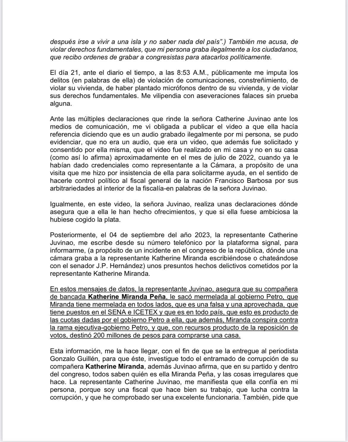 “El 04 de septiembre del año 2023, la representante Catherine Juvinao, me escribe desde su número telefónico por la plataforma signal, para informarme, (a propósito de un incidente en el congreso de la república, dónde una cámara graba a la representante Katherine Miranda escribiéndose o chateándose con el senador J.P. Hernández) unos presuntos hechos delictivos cometidos por la representante Katherine Miranda”.