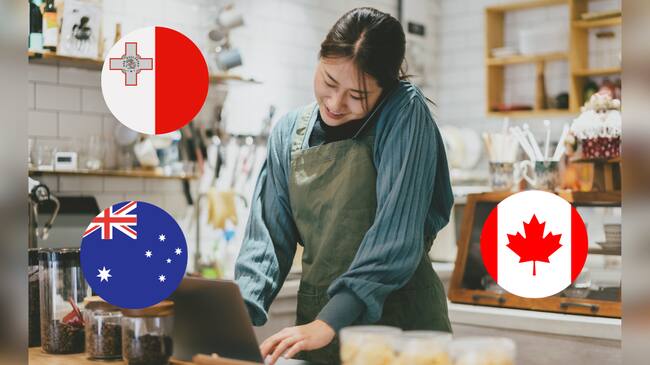 Mujer joven trabajando en restaurante / Bandera Canadá, Malta y Australia (Getty Images)