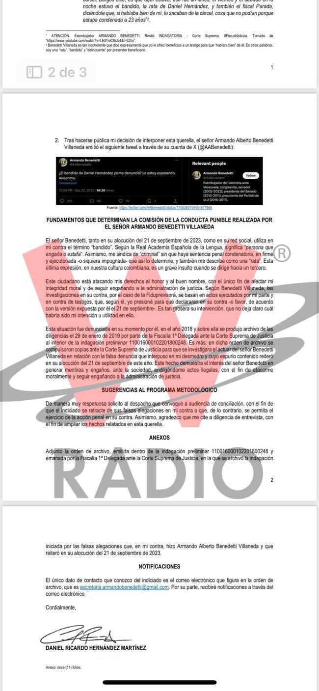 La W conoció en primicia el documento que el fiscal delegado ante el Tribunal Superior de Bogotá, Daniel Hernández Martínez, denunció al exembajador de Colombia en Venezuela, Armando Benedetti, por los delitos de injuria y calumnia.