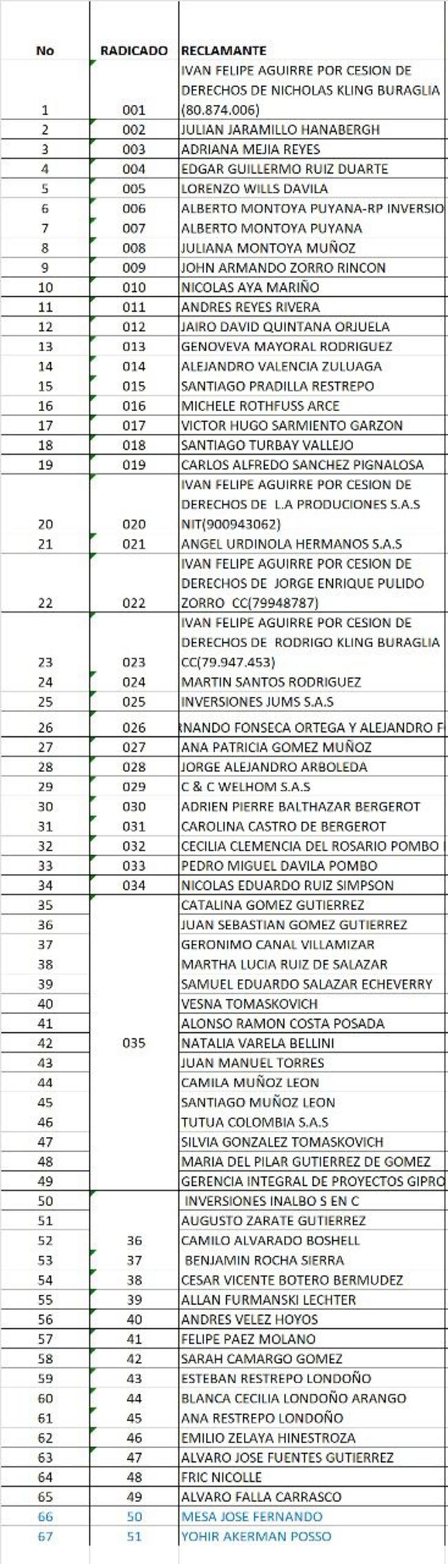 Entre ellos se encuentran Martín Santos, hijo del expresidente Juan Manuel Santos; el excongresista Alberto Montoya Puyana; la modelo y relacionista pública Carolina Castro de Bergerot; los empresarios Pedro Dávila y Augusto Zárate Gutiérrez (dueño de Van Camps), y el columnista Yohir Akerman.