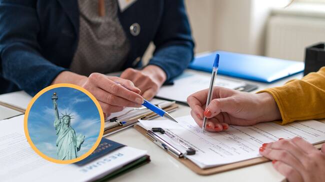 De fondo, una persona llenando una solicitud en un formulario de papel. En el círculo, la estatua de la Libertad / Fotos: GettyImages