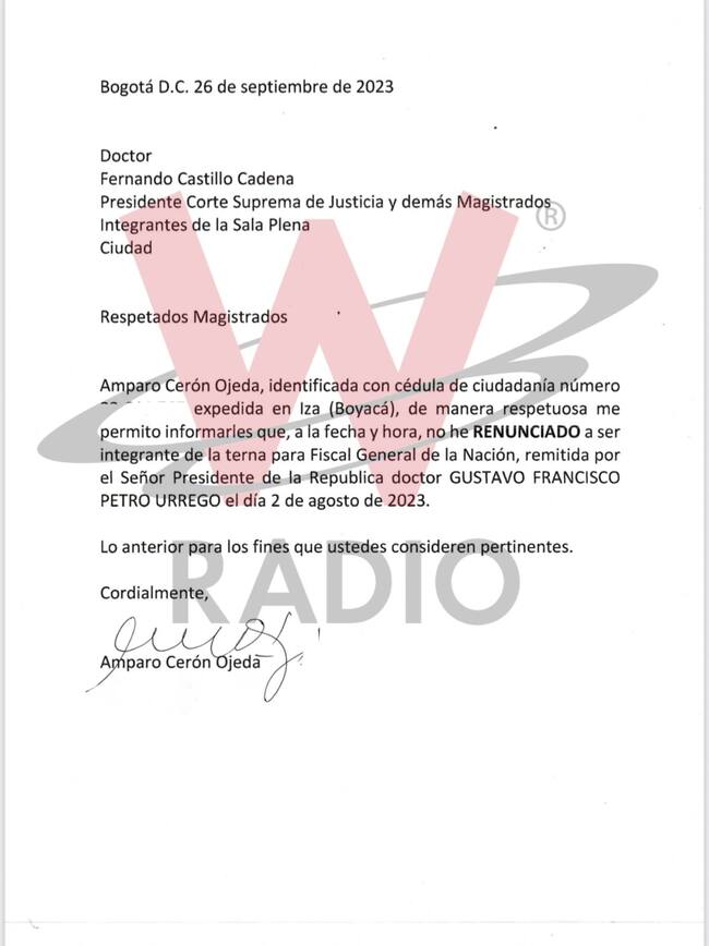 W Radio conoció en primicia que a través de una carta, Amparo Cerón, quien figuró en la primera terna para fiscal general de la Nación, presentada el pasado 2 de agosto por el presidente Gustavo Petro, señaló que nunca renunció.