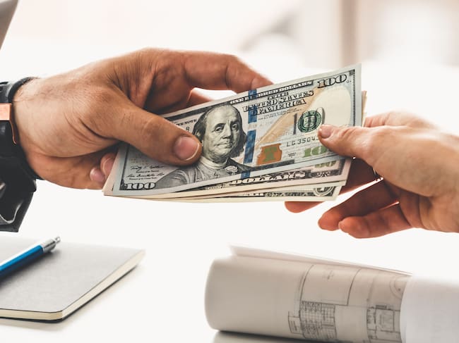 Persona entregando un monto de dinero en dólares estadounidenses a otra persona (Foto vía Getty Images) / NanoStockk