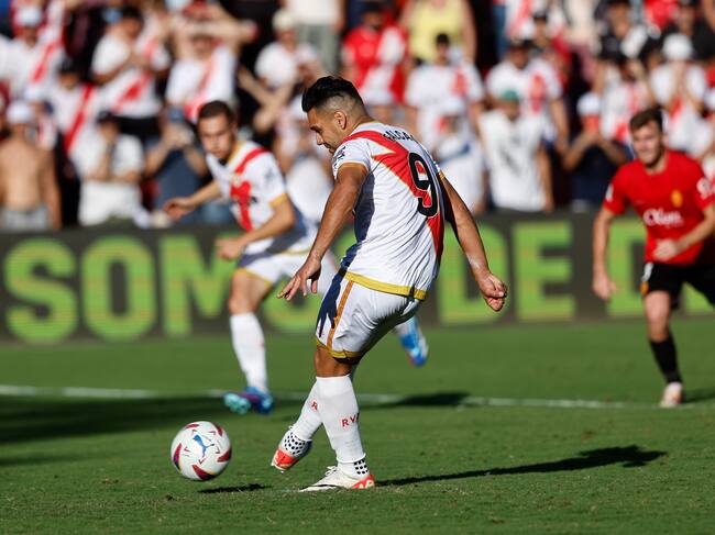 El delantero del Rayo Vallecano Radamel Falcao marca de penalti ante el Mallorca durante el partido correspondiente a la jornada 8 de LaLiga EA Sports que enfrenta al Rayo Vallecano y RCD Mallorca este sábado en el Campo de Fútbol de Vallecas. Foto: EFE/Rodrigo Jiménez / Rodrigo Jimenez (EFE)