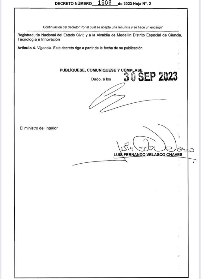 Por otro lado, el Ministerio del Interior dejó listo el decreto que nombra como alcalde encargado de Medellín a Óscar Hurtado, actual secretario de Gobieno.