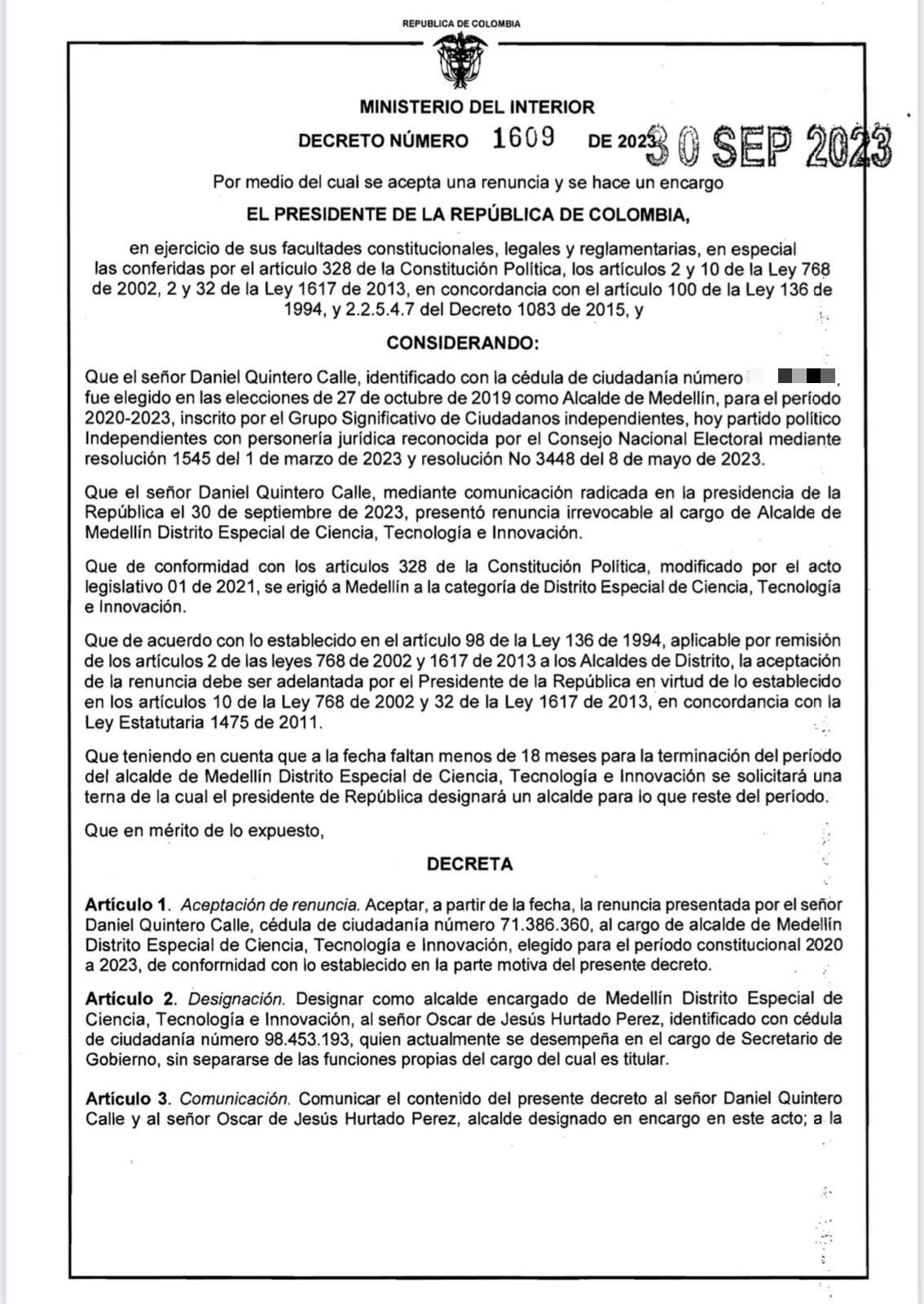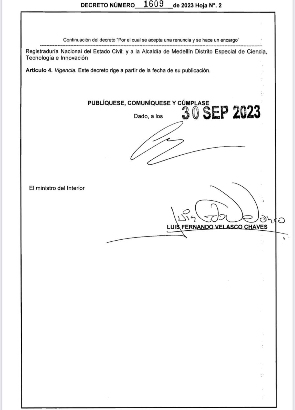 Por otro lado, el Ministerio del Interior dejó listo el decreto que nombra como alcalde encargado de Medellín a Óscar Hurtado, actual secretario de Gobieno.
