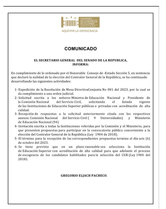 La fecha de elección del próximo contralor general de la República parece seguir enredada. Este lunes se conoció un pronunciamiento del secretario general del Senado, Gregoria Eljach, donde explica los avances en el proceso, pero sin dar claridad aún sobre el tiempo que tardará.