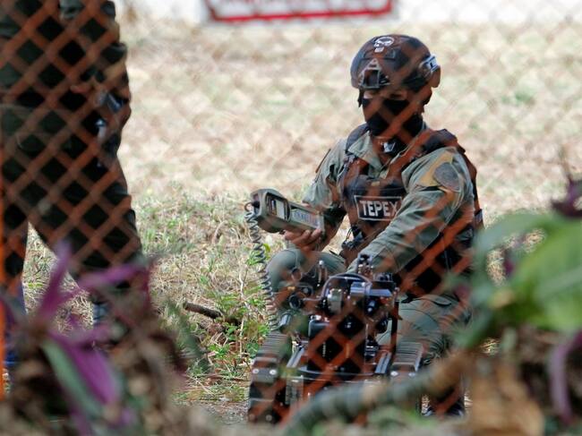 AME9932. CÚCUTA (COLOMBIA), 11/08/2023.- Policías inspeccionan una zona el Aeropuerto Internacional Camilo Daza de la ciudad de Cúcuta (Colombia). La Policía colombiana detonó de manera controlada este viernes una maleta cargada con explosivos que fue encontrada en el perímetro del aeropuerto internacional Camilo Daza, de Cúcuta, la principal ciudad de la frontera con Venezuela, lo que obligó a la suspensión de las operaciones aéreas. EFE/ Mario Caicedo / Mario Caicedo (EFE)