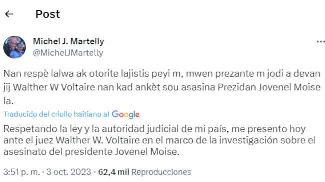 Martelly, quien no ofreció declaraciones a los medios tras salir del interrogatorio, colgó luego un mensaje en su cuenta de X (antes Twitter).