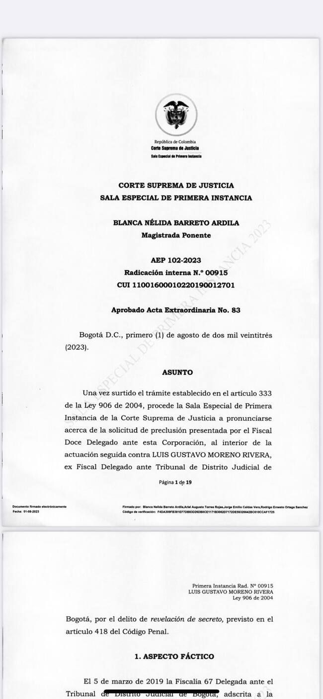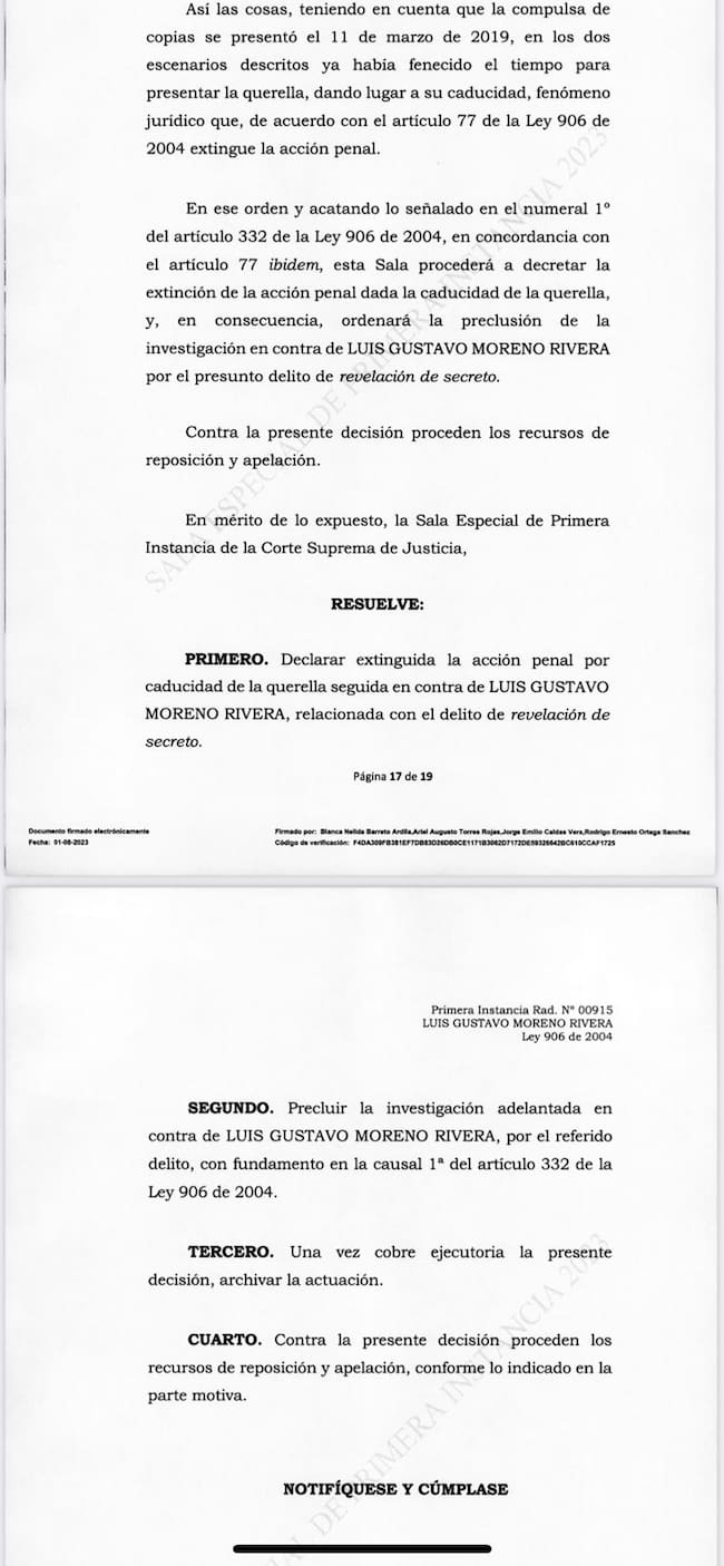 La Corte Suprema de Justicia estudió el caso y señaló que no es posible determinar con exactitud la fecha de ocurrencia de la presunta revelación de secreto por parte de Gustavo Moreno, tal y como la Fiscalía ha indicado es posible que esta hubiera tenido lugar entre el 29 de marzo y 7 de abril de 2017.