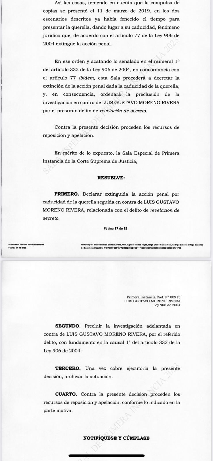 La Corte Suprema de Justicia estudió el caso y señaló que no es posible determinar con exactitud la fecha de ocurrencia de la presunta revelación de secreto por parte de Gustavo Moreno, tal y como la Fiscalía ha indicado es posible que esta hubiera tenido lugar entre el 29 de marzo y 7 de abril de 2017.