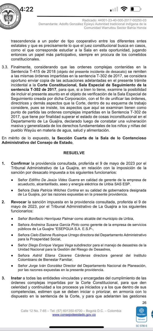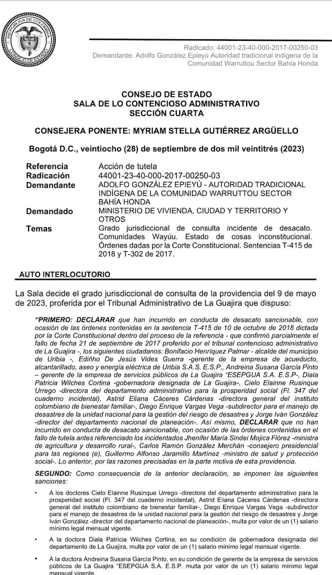 Sin embargo, el Consejo de Estado estudió el desacato y determinó que, además de dejar en firme la sanción por desacato en contra de la actual gobernadora Wilches con una multa de 1 SMLV, como lo impuso el Tribunal de La Guajira, la decisión también sancionó a Ediñho De Jesús Vides Guerra en calidad de gerente de la empresa de acueducto, alcantarillado, aseo y energía eléctrica de Uribia SAS ESP.