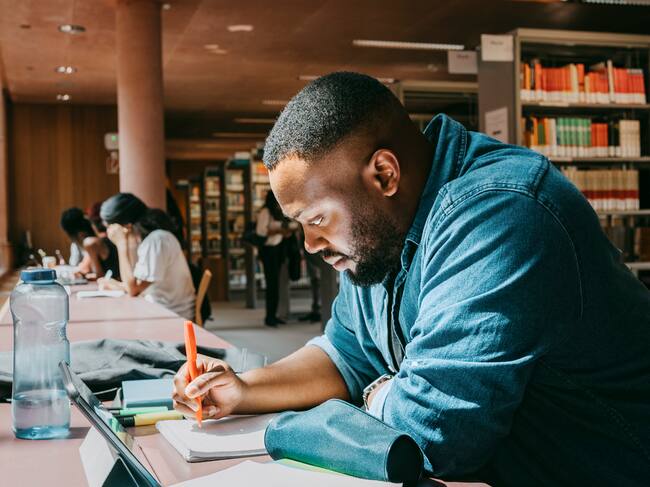 Estudiante de posgrado en una biblioteca escribiendo en un cuaderno / Foto: GettyImages / Maskot