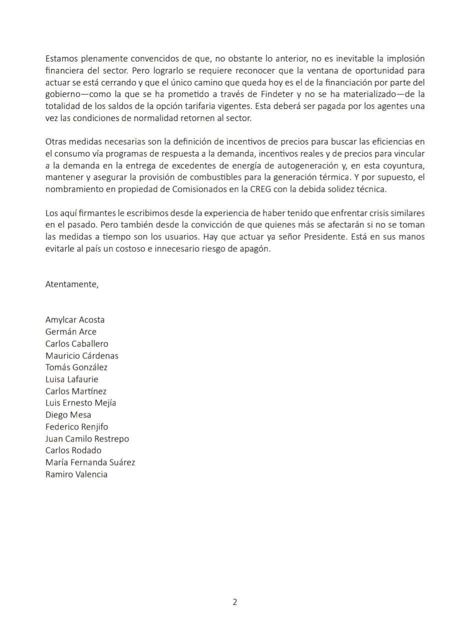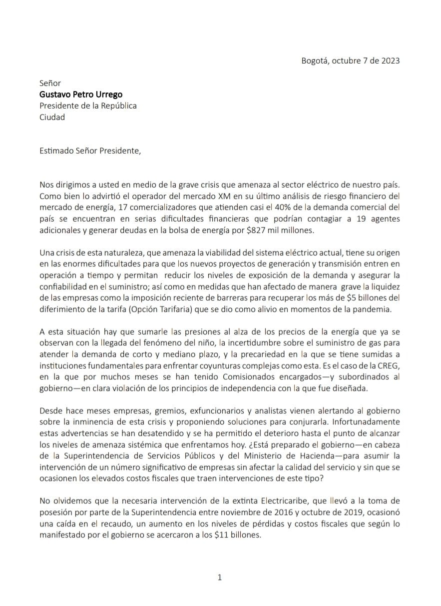 “Desde hace meses empresas, gremios, exfuncionarios y analistas vienen alertando al gobierno sobre la inminencia de esta crisis y proponiendo soluciones para conjurarla. Infortunadamente, estas advertencias se han desatendido y se ha permitido el deterioro hasta el punto de alcanzar los niveles de amenaza sistémica que enfrentamos hoy”, dice otro aparte del documento.