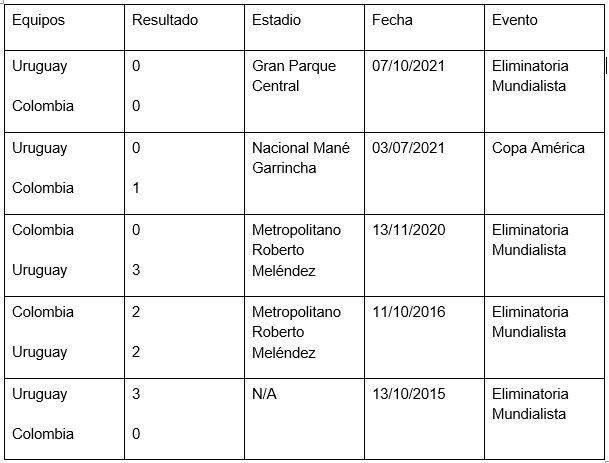 Colombia y Uruguay son una rivalidad añeja del continente sudamericano. Han tenido la oportunidad de enfrentarse en varias ocasiones en torneos oficiales de la CONMEBOL y la FIFA. Son partidos aguerridos y técnicamente bien jugados por ambas partes.