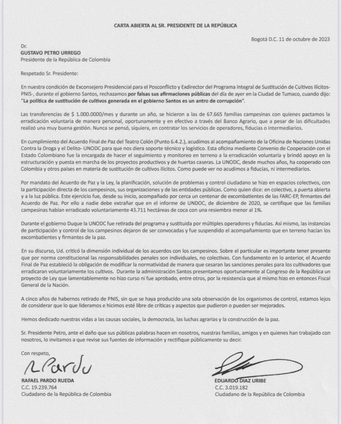 A través de una carta abierta, Rafael Pardo, exalto consejero presidencial de Posconflicto, y Eduardo Díaz, exdirector del Programa Integral de Sustitución de Cultivos, rechazan que el actual jefe de Estado haya calificado esa política como un “antro de corrupción”, lo cual señalan es “falso”.