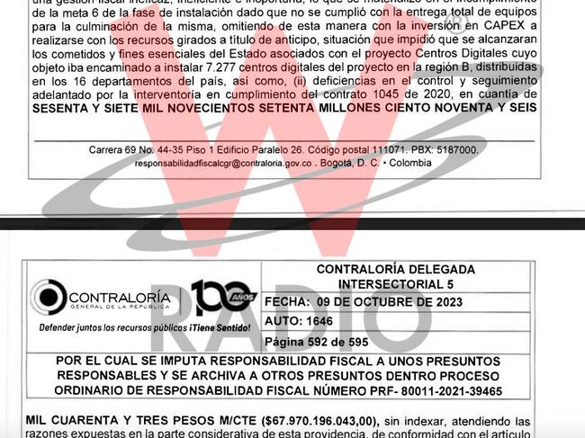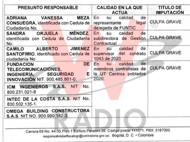 Sigue La W conoció en exclusiva un fallo de la Contraloría General de la República con el que se imputa responsabilidad fiscal por 69.970 millones de pesos a tres exfuncionarios del Ministerio de las Tecnologías de la Información y las Comunicaciones (TIC) y a las empresas vinculadas con el escándalo de Centros Poblados en Colombia.