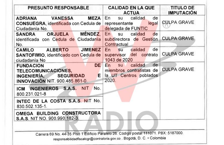 Sigue La W conoció en exclusiva un fallo de la Contraloría General de la República con el que se imputa responsabilidad fiscal por 69.970 millones de pesos a tres exfuncionarios del Ministerio de las Tecnologías de la Información y las Comunicaciones (TIC) y a las empresas vinculadas con el escándalo de Centros Poblados en Colombia.