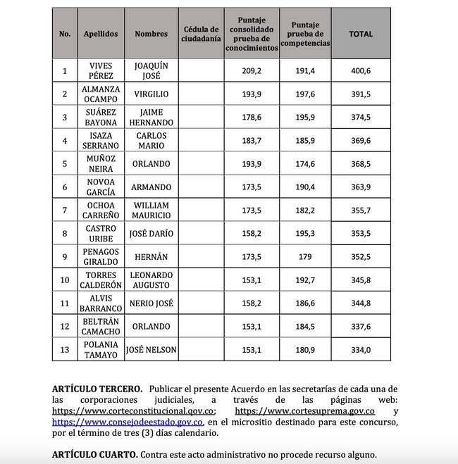 Por esa razón, únicamente continúan en el proceso las siguientes personas relacionadas en estricto orden descendente y el puntaje correspondiente: