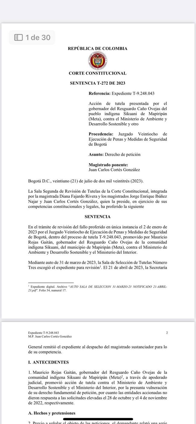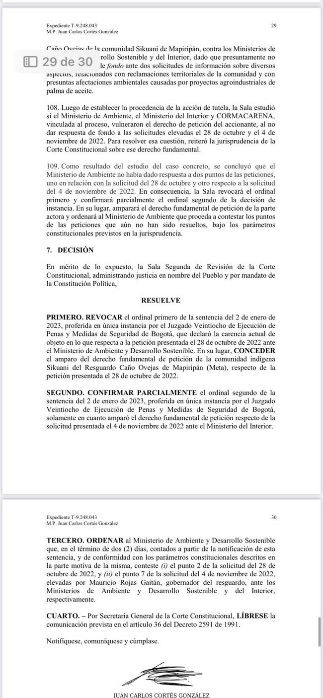 La Corte Constitucional le ordenó al Ministerio de Ambiente responder de forma clara, precisa y coherente a todos los puntos de un derecho de petición presentado por Mauricio Rojas, gobernador del resguardo Caño Ovejas de la comunidad indígena Sikuani de Mapiripán (Meta).