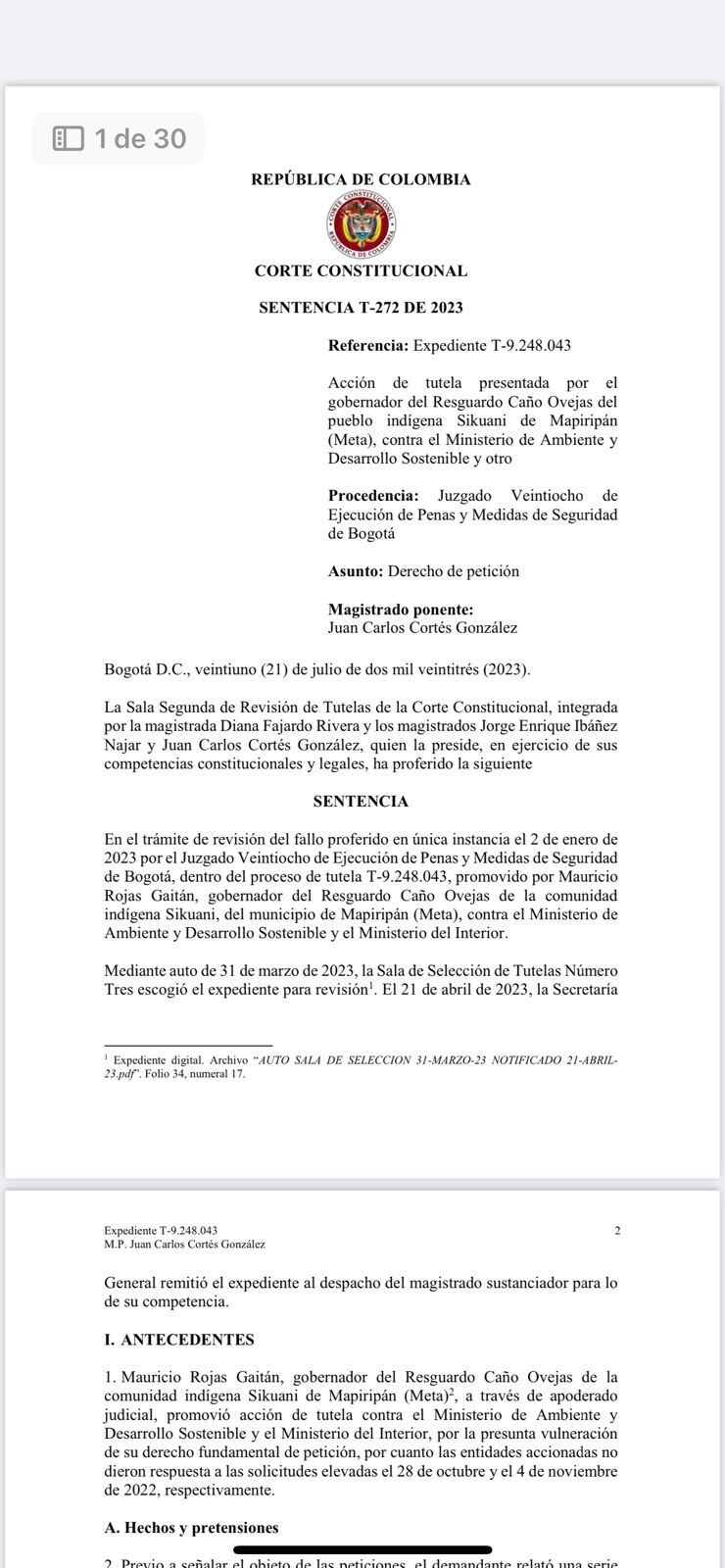 La Corte Constitucional le ordenó al Ministerio de Ambiente responder de forma clara, precisa y coherente a todos los puntos de un derecho de petición presentado por Mauricio Rojas, gobernador del resguardo Caño Ovejas de la comunidad indígena Sikuani de Mapiripán (Meta).