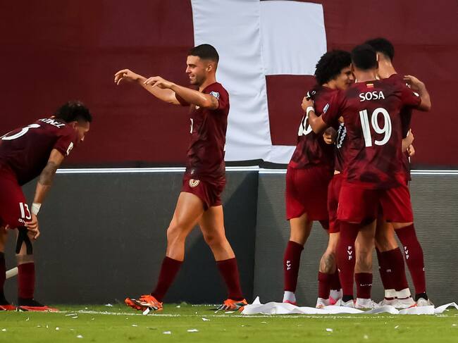 Jugadores de Venezuela celebran un gol hoy, en un partido de las Eliminatorias Sudamericanas para la Copa Mundial de Fútbol 2026 entre Venezuela y Chile en el estadio Monumental de Maturín en Maturín (Venezuela). EFE/ Miguel Gutiérrez / Miguel Gutiérrez (EFE)