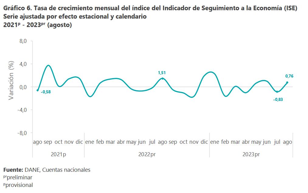 Por otro lado, el Dane expuso que en su comportamiento mensual la actividad económica del país tuvo un mejor comportamiento, esto al comparar julio con agosto de este mismo año, así las cosas, se expuso que “para el mes de agosto de 2023pr el ISE en su serie ajustada por efecto estacional y calendario se ubicó en 122,14, lo que representó un crecimiento de 0,76%, respecto al mes de julio de 2023pr (121,22)”.