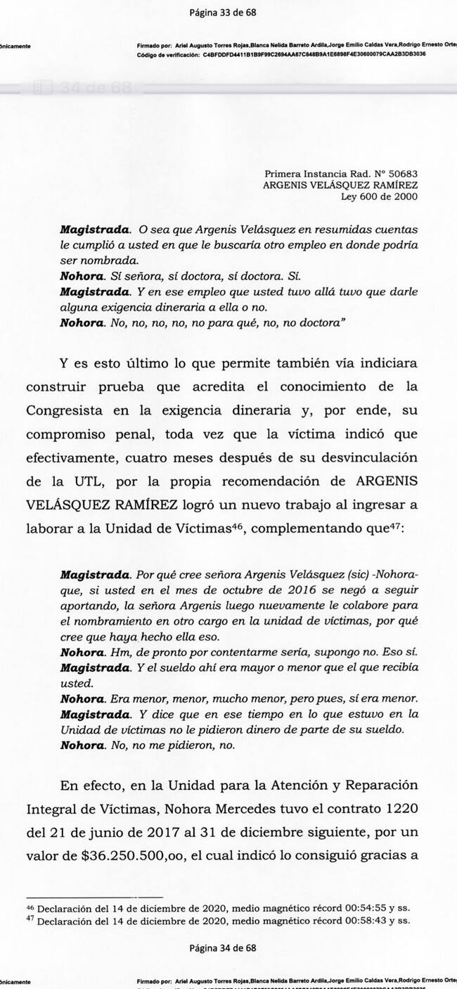 La Corte Suprema de Justicia condenó a 10 años y 6 meses de prisión a la exrepresentante Argenis Velásquez por exigir parte del salario a una integrante de su UTL. También decidió inhabilitarla por el mismo tiempo para ejercer funciones públicas y al pago de 99 SMLV para la época de los hechos.