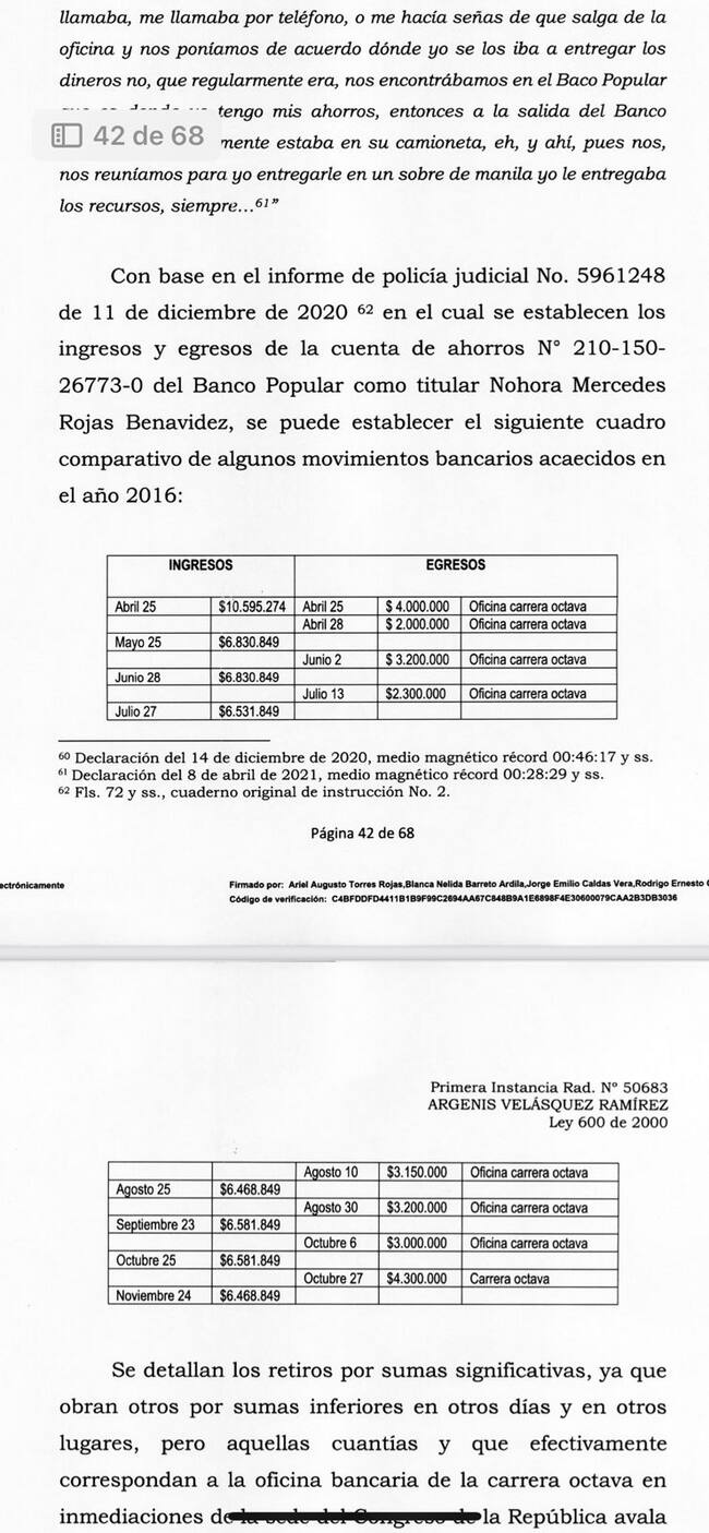 Recordemos que la funcionaria Nohora Mercedes Rojas realizó pagos por $3.200.000 mensuales, con un total de $25.600.000. Sin embargo, esa situación finalizó en el mes de octubre de 2016, cuando se negó a seguir entregando parte de sus ingresos salariales a Chávez Jojoa reclamándole que de haber existido conocimiento previo de esa condición no hubiese apoyado a la enjuiciada en la campaña política para llegar al Congreso de la República, agregando que luego, en enero de 2017, fue declarada insubsistente.