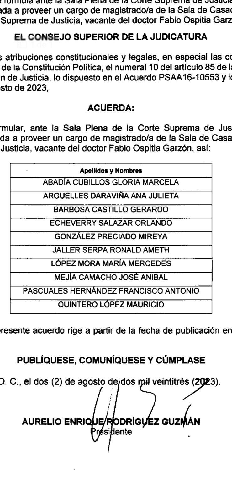 Se trata del aspirante José Aníbal Mejía Camacho, funcionario del despacho del magistrado Francisco Farfán, y quien desde el 02 de agosto de 2023 se encuentra en la lista de 10 candidatos para reemplazar al presidente de la sala penal, el exmagistrado Fabio Ospitia, debido a que la vacante aún no ha sido ocupada.