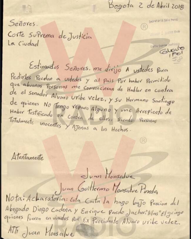 Deyanira Gómez entregó en la Corte Suprema de Justicia la supuesta carta de retractación de Monsalve que incluye una nota aclaratoria en la que el testigo afirma: “Esta carta la hago bajo presión del abogado Diego Cadena y Enrique Pardo Hasche, alias El Gringo, quienes fueron enviado por el expresidente Álvaro Uribe Vélez”. El documento también está publicado en la página.