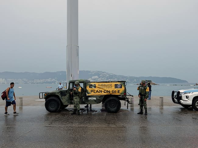 MEX9232. ACAPULCO (MÉXICO), 24/10/2023.- Soldados del Ejército mexicano vigilan hoy como parte de las medidas ante la inminente llegada del huracán Otis, en Acapulco (México). El huracán Otis, que se desplaza por el Pacífico mexicano rumbo al estado de Guerrero, se ha intensificado rápidamente a categoría 4 en la escala Saffir-Simpson y puede alcanzar la categoría 5 en las próximas horas, informó este martes el Servicio Meteorológico Nacional (SMN). EFE/David Guzmán / David Guzmán (EFE)