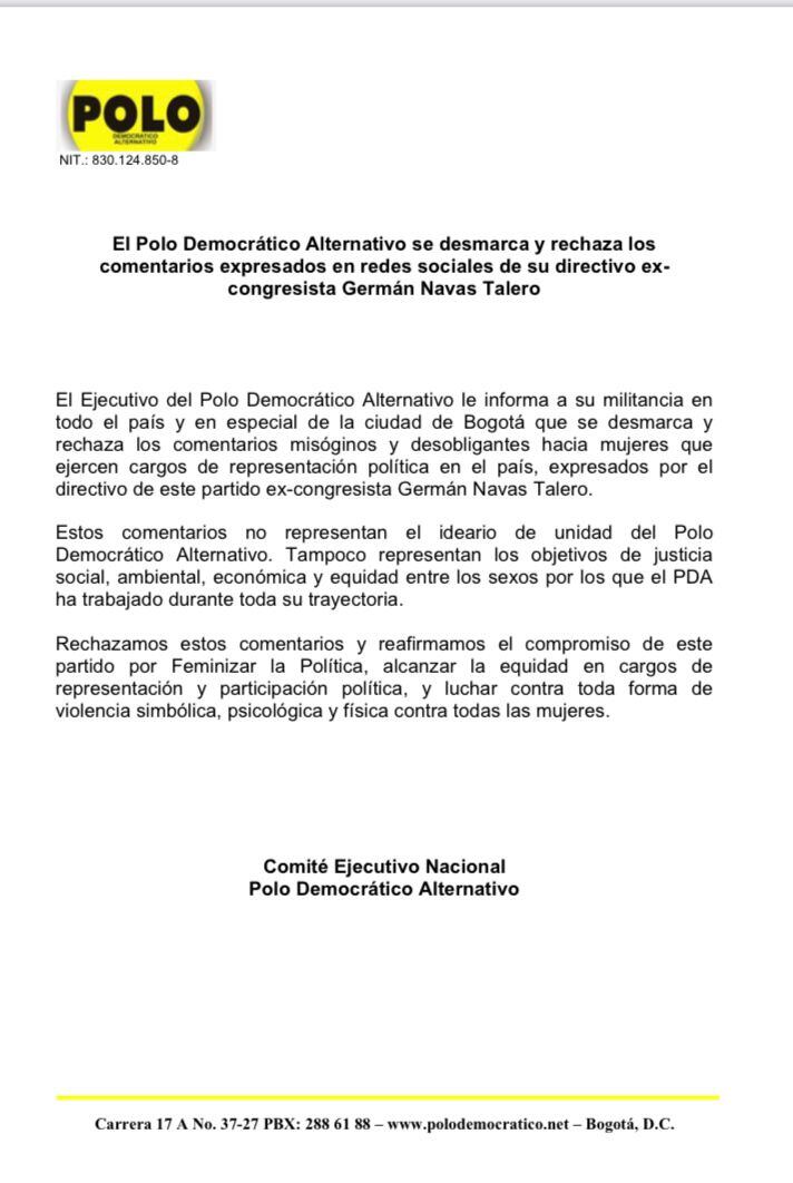 “El Ejecutivo del Polo Democrático le informa a su militancia en todo el país y en especial de la ciudad de Bogotá que se desmarca y rechaza los comentarios misóginos y desobligantes hacia mujeres que ejercen cargos de representación política en el país, expresados por el congresista”, precisa.